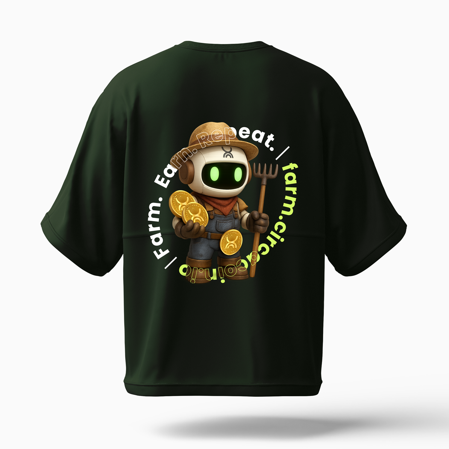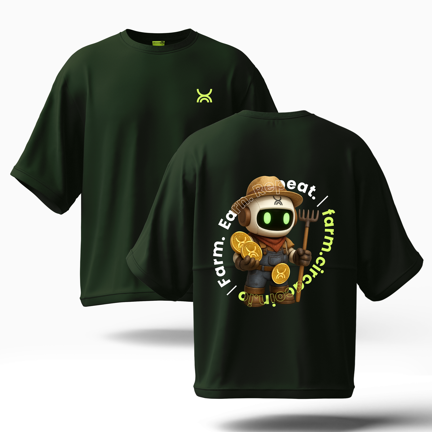 Farm. Earn. Repeat. The Fred Farmer oversized tee embodies the spirit of CirCaCoin farming with our coin-harvesting bot. Oversized comfort for those who let patience and yield power the future of CCC.